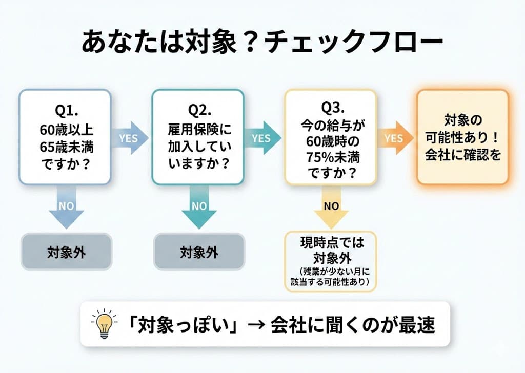 制度上は「60歳到達時の賃金月額」と「支給対象月の賃金」を比較しますが、ここでは正確な定義よりも、まず「自分が対象かどうか」の当たりをつけることが目的です。