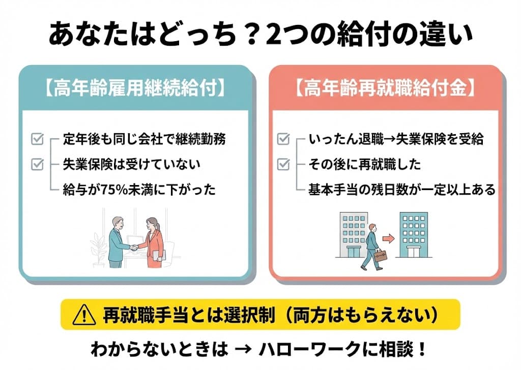 ここまでの内容は、「定年後にそのまま再雇用された方(空白期間なし)」を前提としています。もしあなたがいったん退職して基本手当(失業保険)を受給し、その後に再就職したタイプなら、話が少し変わります。この違いは以下の比較表で確認しましょう。