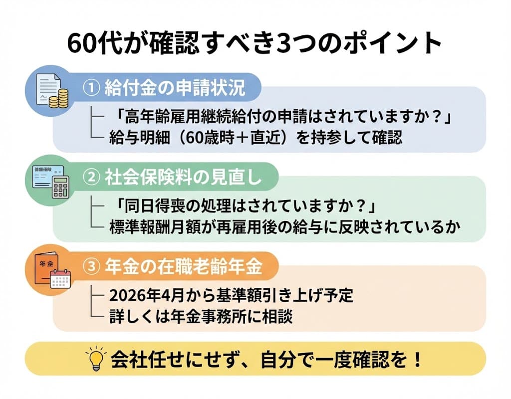 この記事では、高年齢雇用継続給付の対象チェックと会社への聞き方に加えて、社会保険料の見直しや年金との関係まで、60代が見落としがちなお金の落とし穴をまとめて整理します。