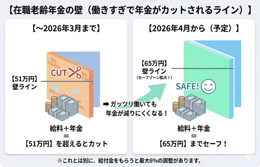 さらに安心材料として、2026年4月からは在職老齢年金の基準額が大幅に引き上げられる方向で調整が進んでいます。