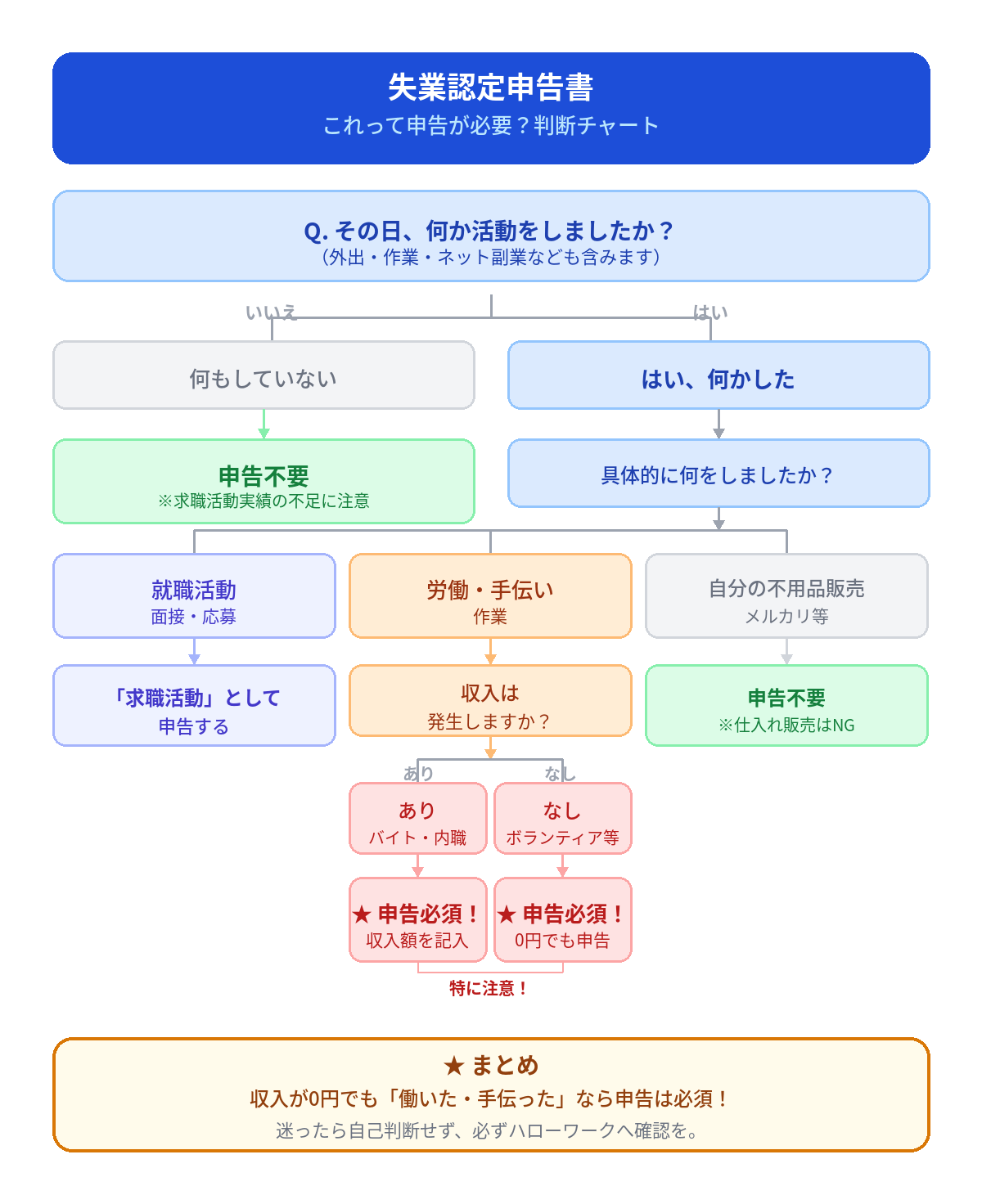 「お金をもらっていないから問題ない」と考えがちですが、収入の有無に関わらず、労働や活動をした事実を申告する必要があります。「その日に就職活動ができなかった」という事実を確認するための申告だからです。