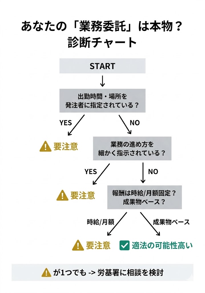 A. いいえ。契約書に「業務委託」と書いてあっても、実態として発注者の指揮命令下で働いていれば偽装請負と判断されます。労働基準監督署や裁判所が重視するのは書類の名称ではなく、出退勤の管理、業務指示の有無、報酬の決め方などの「働き方の実態」です。