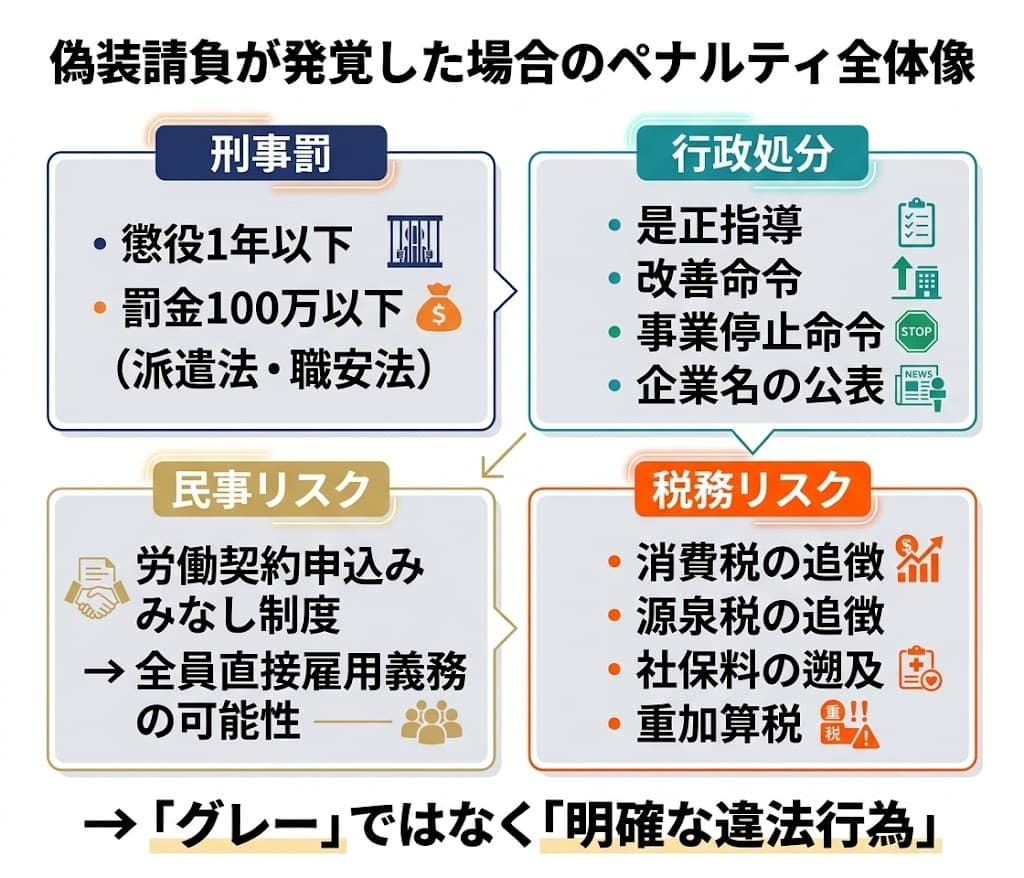 偽装請負は「単なるグレーゾーン」ではなく、明確に法律違反です。摘発された場合のペナルティは極めて重く、企業の存続すら危ぶまれるレベルです。