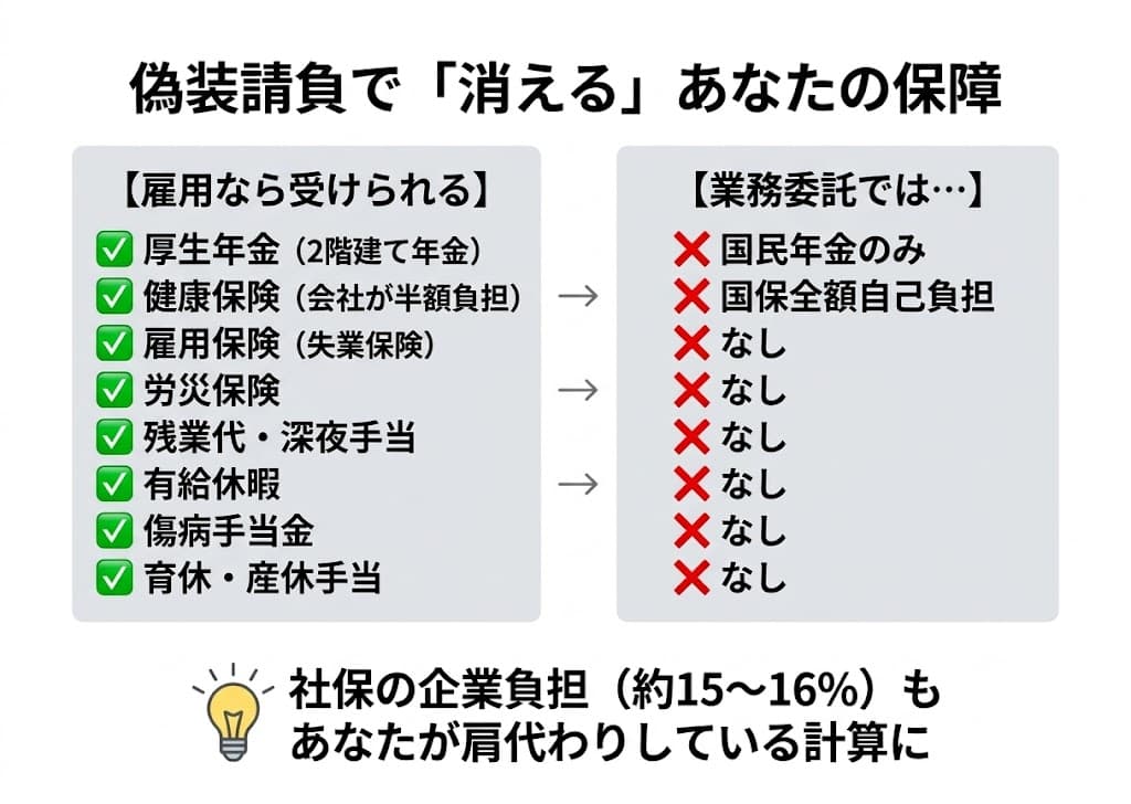 - 働く側は社会保険の保障を失い、年金・失業保険・労災のすべてが自己責任になる
