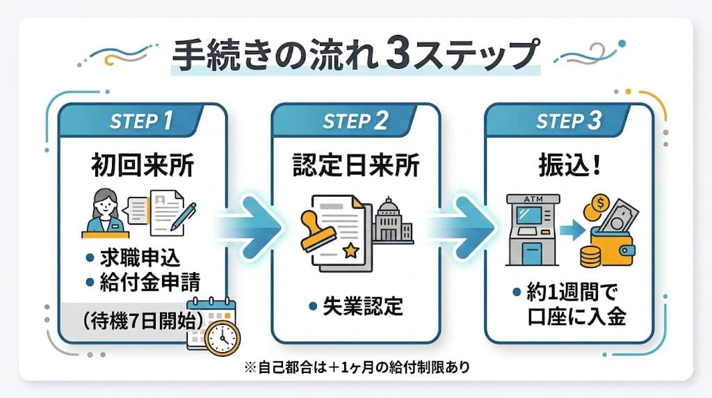 | 振込までの目安 | 待期7日+認定日を経て、約1ヶ月後 | 待期7日+1ヶ月の給付制限(※)+認定日を経て、約2ヶ月後 |
