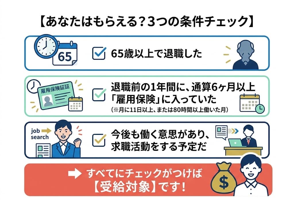 高年齢求職者給付金をもらうには、次の3つをすべて満たす必要があります。