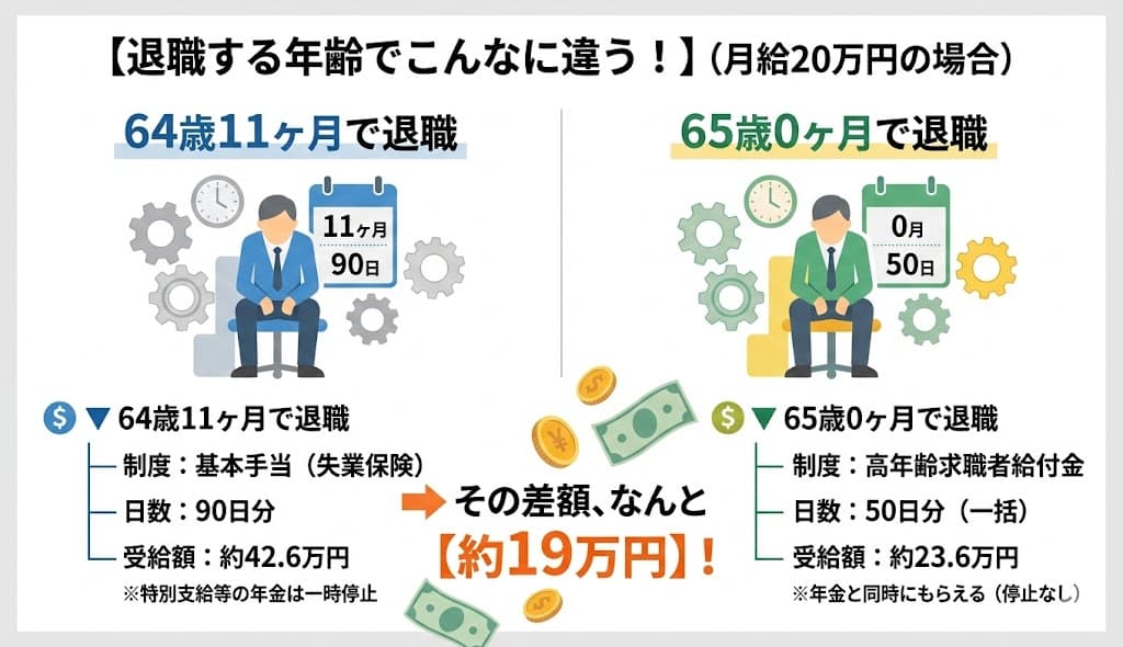 なぜなら、64歳で退職すれば「基本手当」が適用され、給付日数が90日〜150日程度になるからです。65歳以上だと30日分 or 50日分の一時金にとどまります。