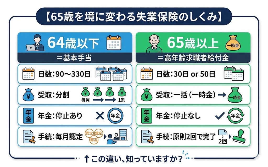結論から言うと、65歳以上でも失業保険は受け取れます。ただし、64歳以下とはまったく別の制度になります。名前も、金額も、受け取り方も違います。