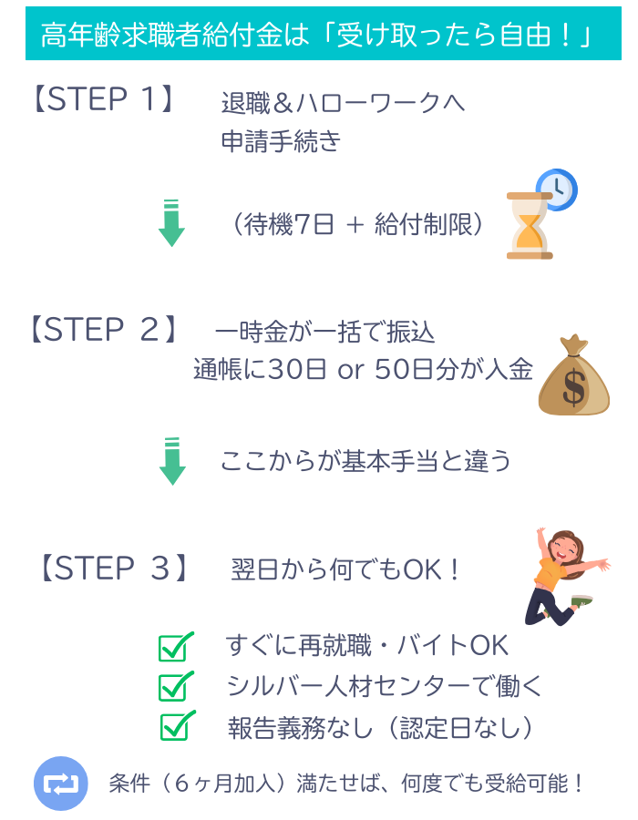 基本手当のように毎月ハローワークに通う必要がなく、手続きもシンプル。「一括でまとめてもらえる」のは、65歳以上ならではの特徴です。