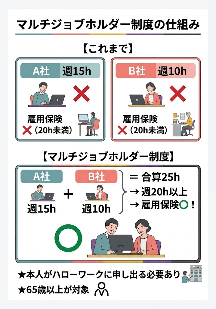 - 適用身分:「マルチ高年齢被保険者」として雇用保険に加入