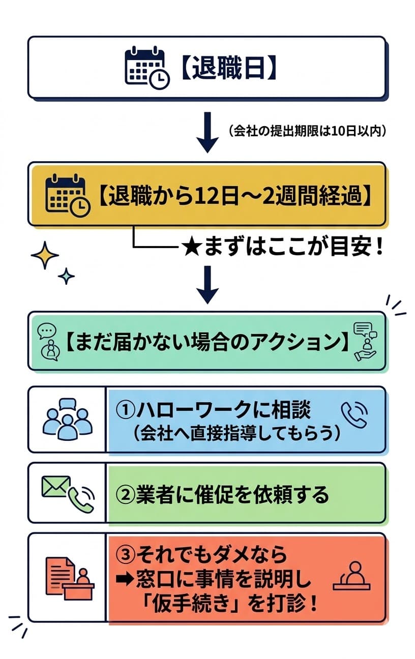 • 離職票が届かない場合は、退職後12日~2週間を目安にハローワークへ相談する